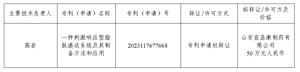 根据沈阳药科大学专利转让/许可审批制度,现将如下项目中专利(申请)权转让、专利实施许可的相关信息进行公示,公示期十五天(2025年11月24日-2025年12月8日),如有任何异议,请向沈阳药科大学科研处反映。