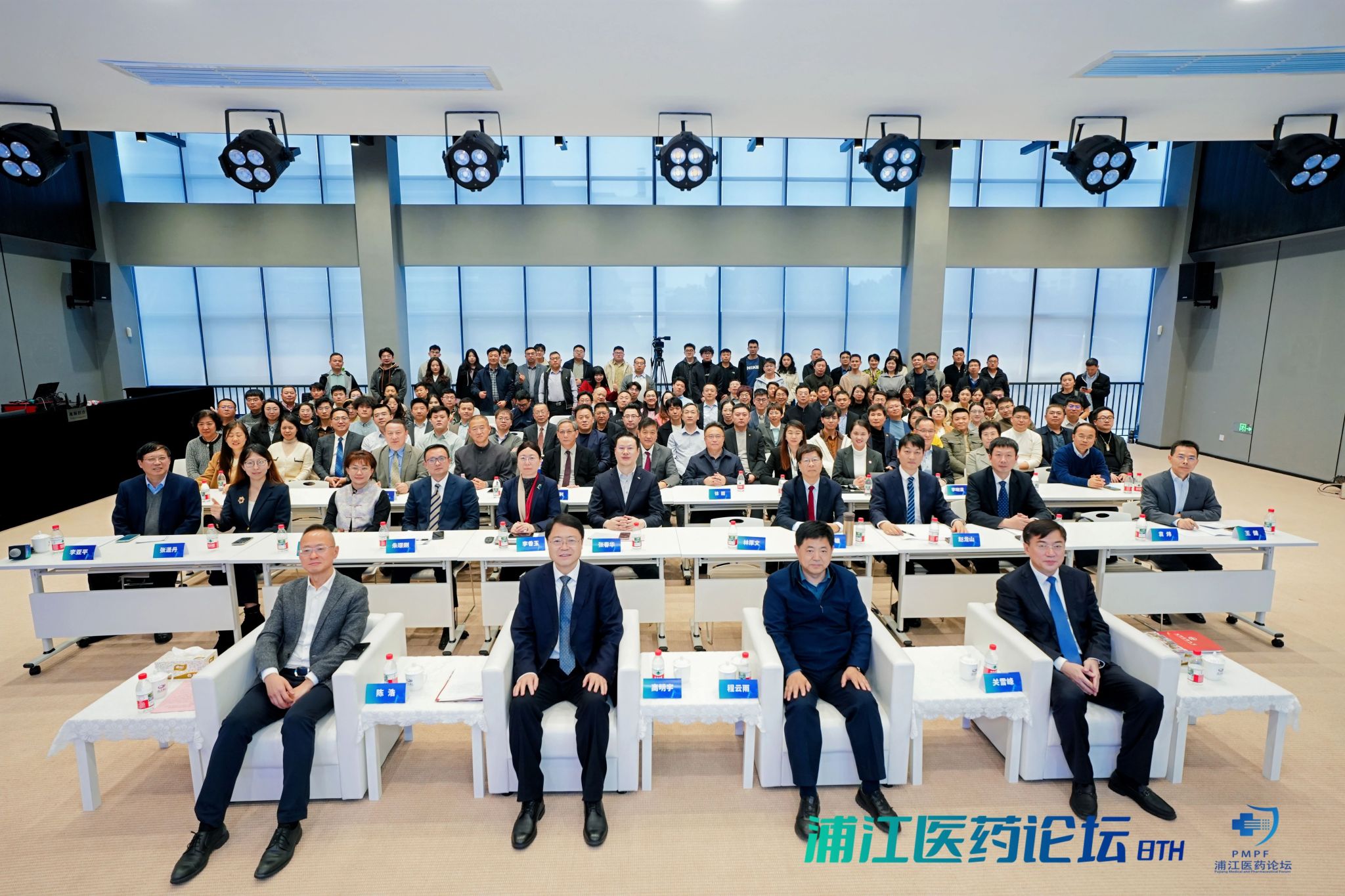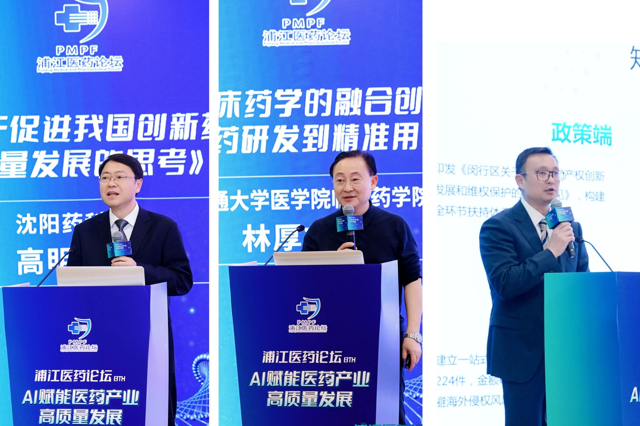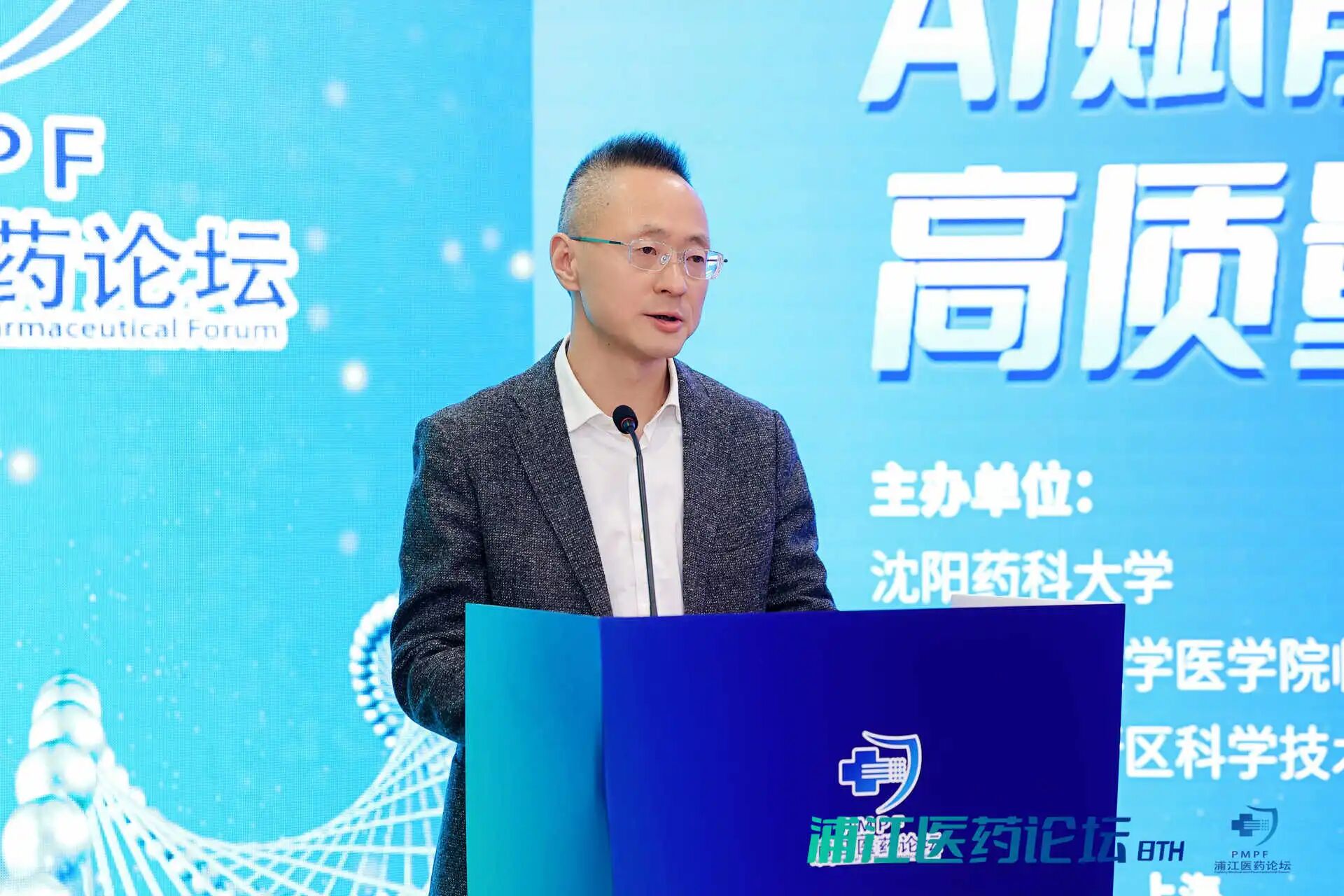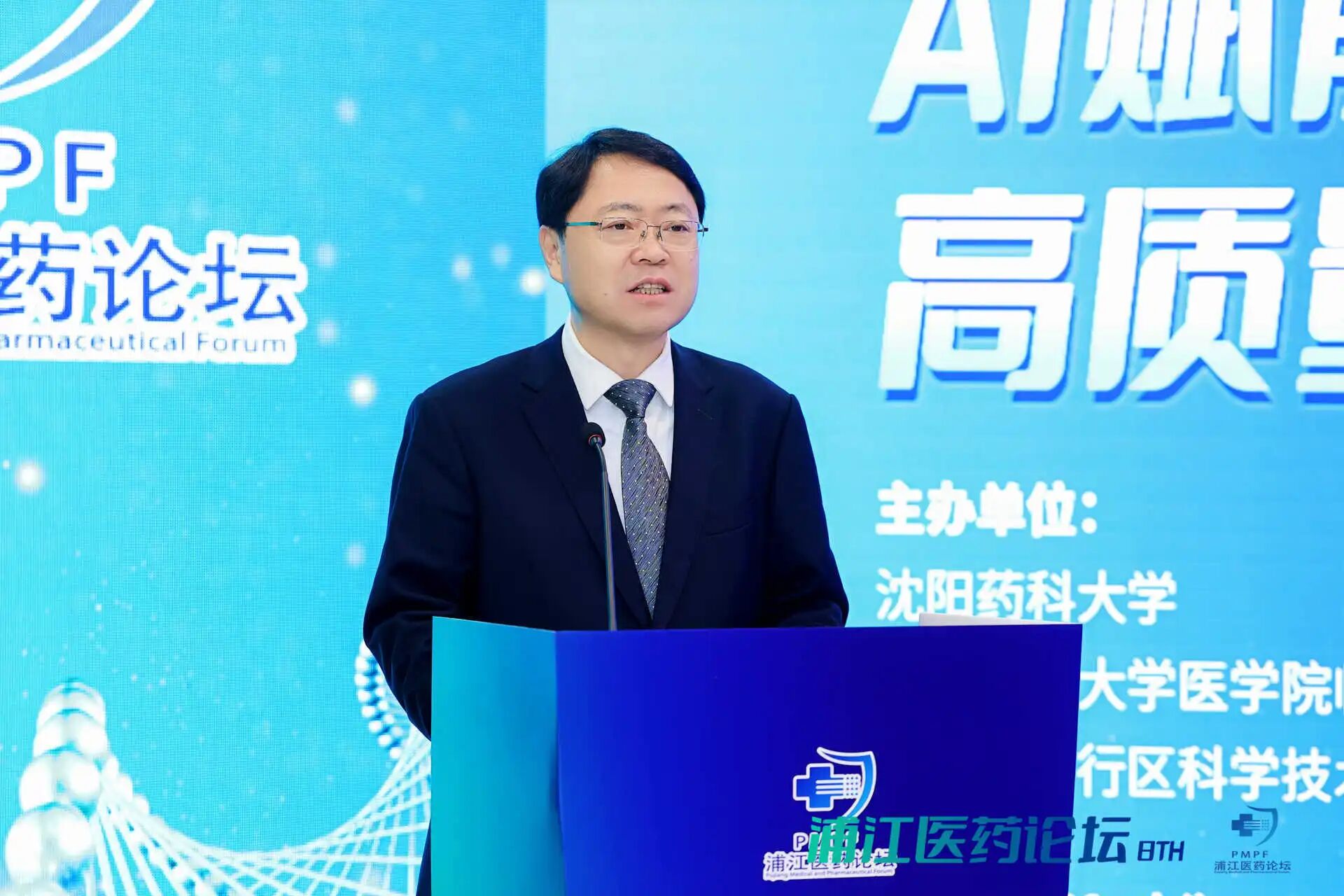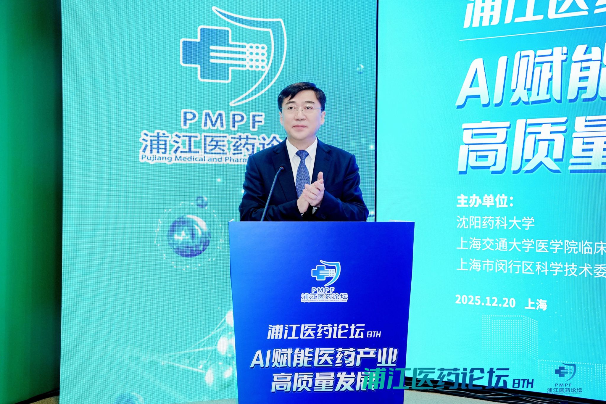 12月20日,由沈阳药科大学联合上海交通大学医学院临床药学院、上海闵行区科学技术委员会共同主办,上海临港浦江国际科技城、沈阳药科大学上海校友会承办的第八届浦江医药论坛在上海市闵行区成功召开。论坛以“AI赋能医药产业高质量发展”为主题,聚焦破解生物医药行业效率瓶颈与精准化难题,分享前沿应用成果,共探未来发展方向。辽宁省人民政府驻上海办事处主任程云雨,临港集团副总裁陈浩,闵行区药品审评核查服务中心主任朱璟刚,闵行区浦江镇党委委员、副镇长祁媛媛,上海交通大学医学院临床药学院院长林厚文,上海市生物医药行业协会执行会长兼秘书长陈少雄,上海长三角医疗器械产业发展促进会副会长袁炜,临港浦江公司党委副书记、总经理张春华,副总经理张潇丹以及近200位科研院所专家学者、医药企业代表参加论坛。我校党委书记高明宇应邀在论坛开幕会上致辞并作主旨报告,党委副书记关雪峰主持论坛开幕会。