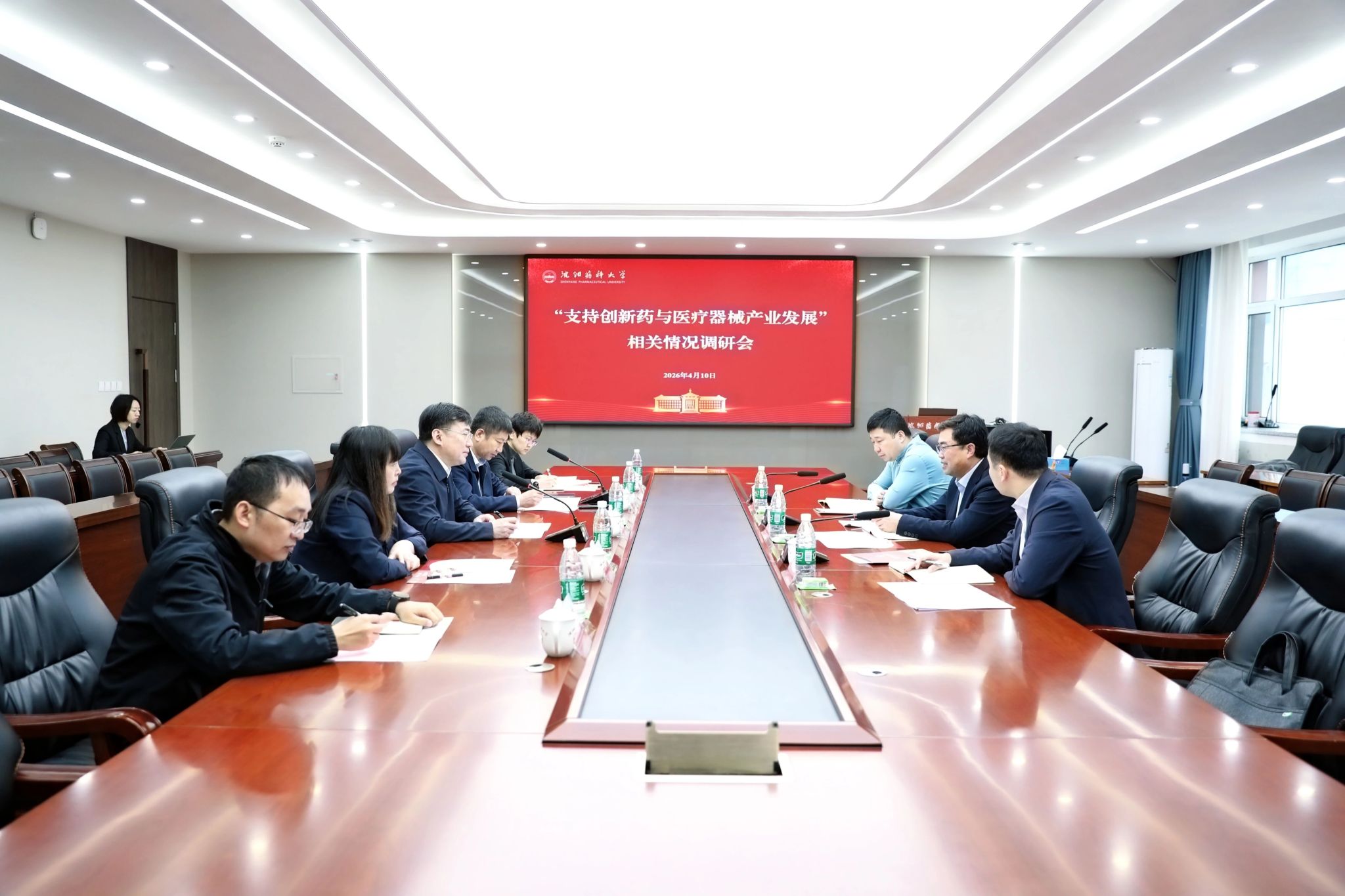 4月10日,辽宁省人民政府研究室党组成员、副主任翟连江一行来到学校,深入调研创新药及医疗器械领域产学研融合、医药人才队伍建设及产业高质量发展情况。校党委书记关雪峰,党委常委、副校长李可强出席调研座谈。省政府研究室社会发展处处长吴禹昊、省政府研究室社会发展处干部雷海涛同行调研。调研座谈会由李可强主持。