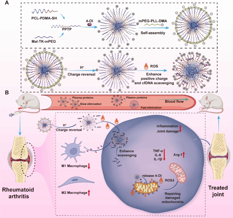 类风湿性关节炎(RA)中,游离DNA(cfDNA)的清除被认为是一种具有潜力的抗炎治疗策略。尽管阳离子材料已被广泛用于捕获cfDNA,但其在体内递送过程中的安全性仍是关键挑战。此外,巨噬细胞介导的炎症反应也在RA进展中发挥重要作用。