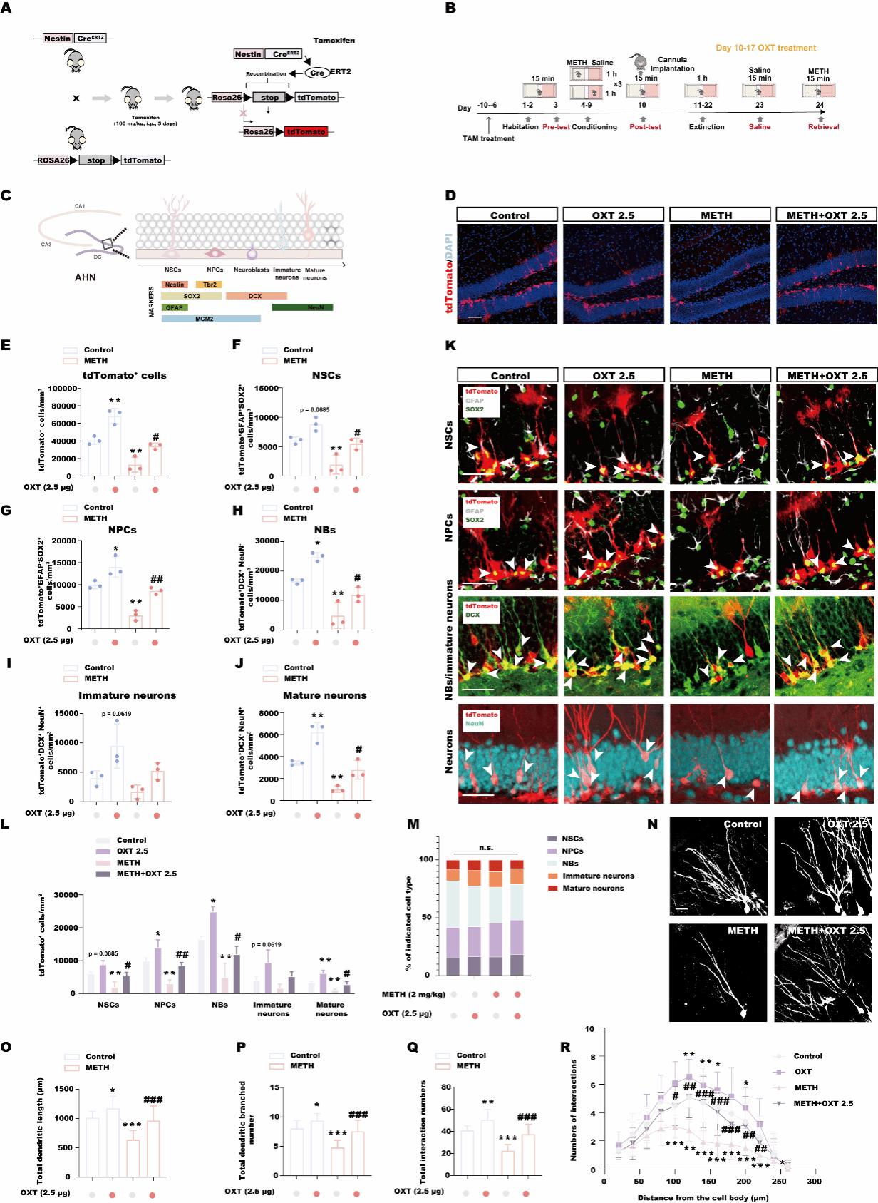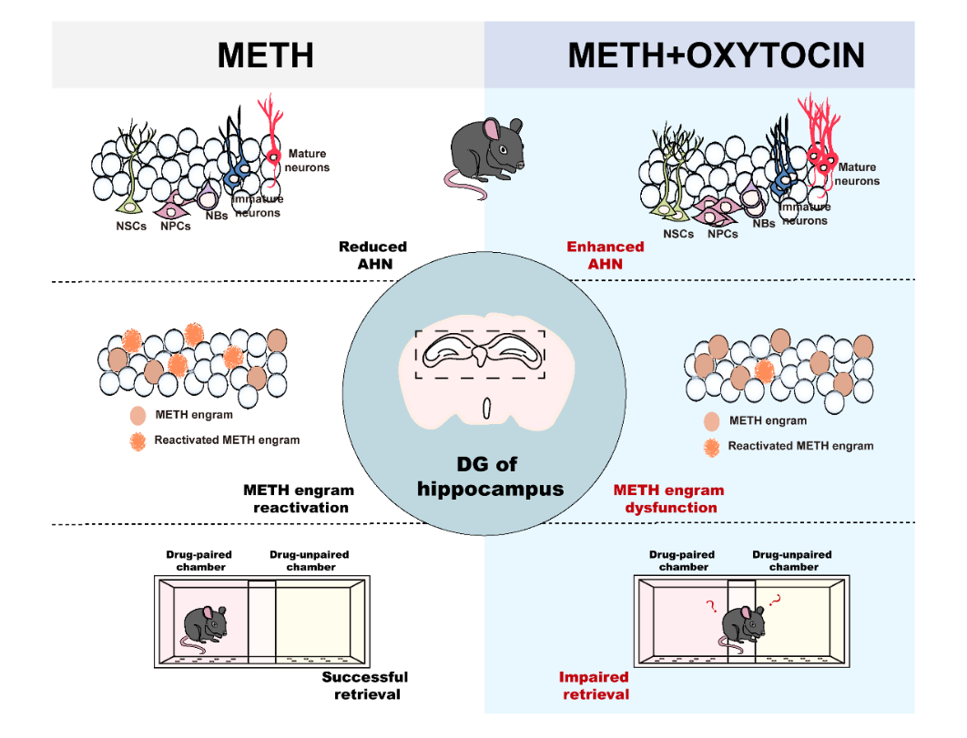甲基苯丙胺(Methamphetamine, METH),俗称冰毒,具有极强成瘾性。METH的滥用现象屡禁不止,但遗憾的是,至今仍无有效药物治疗METH复吸。有证据表明,复吸行为是由成瘾记忆过程所驱动的,而破坏成瘾记忆的再唤起过程在治疗METH成瘾复吸中表现出巨大的潜力。该研究系统阐述了催产素(Oxytocin, OXT)通过调控成体海马神经发生(Adult hippocampal Neurogenesis, AHN)在METH成瘾记忆再唤起中的重要作用。本研究综合运用转基因小鼠、神经元活动依赖工具、化学遗传学等技术,揭示了METH成瘾记忆获得后,小鼠AHN水平显著降低,而OXT能够通过提高AHN水平,影响海马METH相关记忆印迹细胞功能,抑制小鼠METH成瘾记忆的再唤起过程。该发现揭示了OXT抗METH成瘾的新机制,为理解OXT抗METH成瘾的作用提供了新的思考,并为将其研发成为抗成瘾复吸药物提供新的理论依据和实验基础。