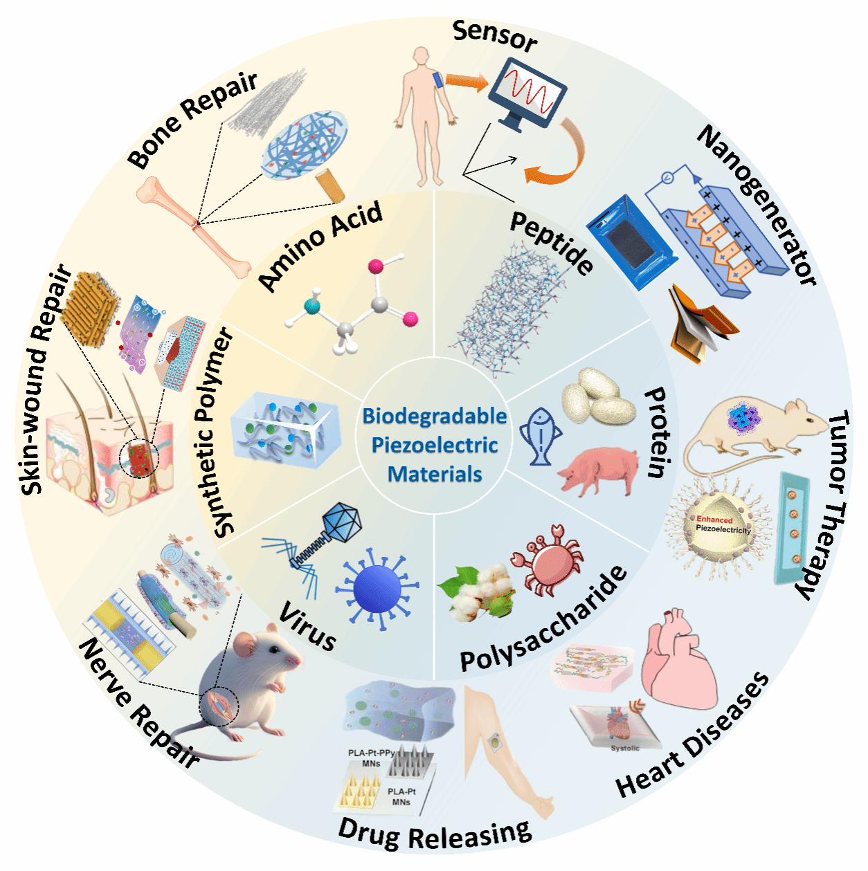 该综述系统梳理了天然(氨基酸、多肽、蛋白质和多糖等)与合成(PLLA、PHB和压电水凝胶等)两大类可降解压电材料,深入分析其压电性能、降解行为和机械性能等,同时总结了这些材料的加工制备策略。介绍了由这些材料所制备的电子器件在骨修复、伤口修复、神经修复、药物释放、心脏起搏、肿瘤治疗、能量收集和传感器中的应用。文章还指出,未来的研究需要致力于平衡压电性能与降解速率、确保材料的长期生物安全性以及推动大规模标准化制备等挑战。通过材料科学、电子工程与临床医学的深度融合,可降解压电材料有望催生一个全新的“短暂电子医学”时代,实现人体与医疗设备更智能、更安全、更和谐的交互。