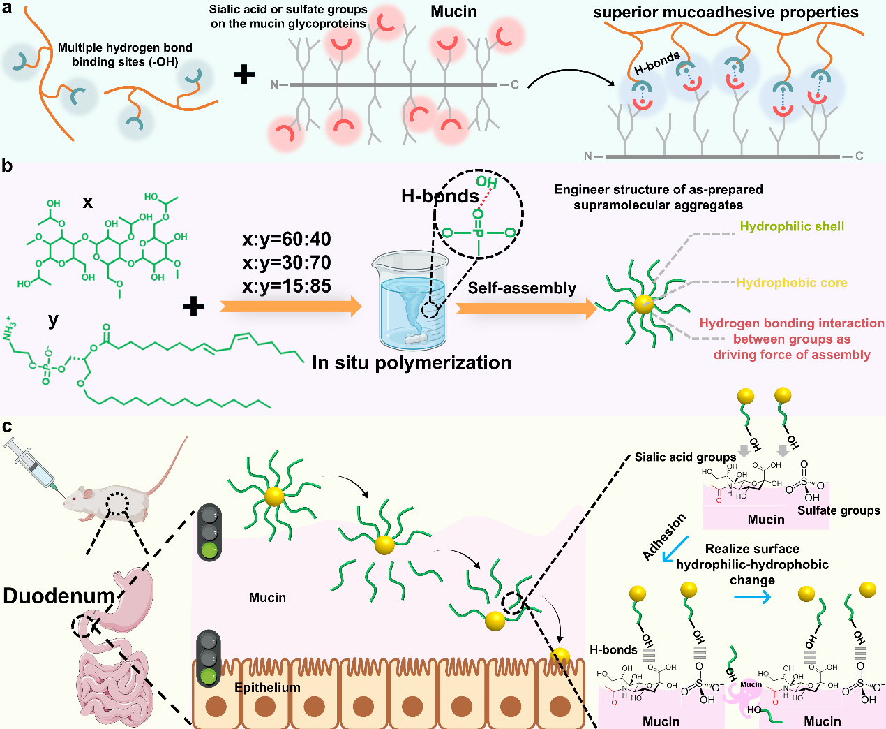 该超分子聚集体凭借亲水外壳和疏水核心之间的非共价键的可逆性以及高分子材料优异的黏膜粘附特性,在粘液渗透过程中逐渐脱去外面的亲水外壳,到达上皮细胞表面时完全暴露疏水核心,进而促进载体被上皮细胞摄取的能力,提高药物口服递送效率。此外,不同摩尔比制备得到的具有核壳结构的超分子聚集体具有不同的亲水外壳厚度。不同的亲水外壳厚度完成完全脱落所需要的黏液层深度与大鼠小肠的十二指肠、空肠、回肠肠段粘液层深度相匹配,因此该口服纳米载体也具有一定的肠段靶向性。该研究为不依赖合成方法、利用传统药用辅料构建界面性质可转换的、可连续克服性质截然相反生理屏障的高效递送纳米载体提供了创新性的设计思路。