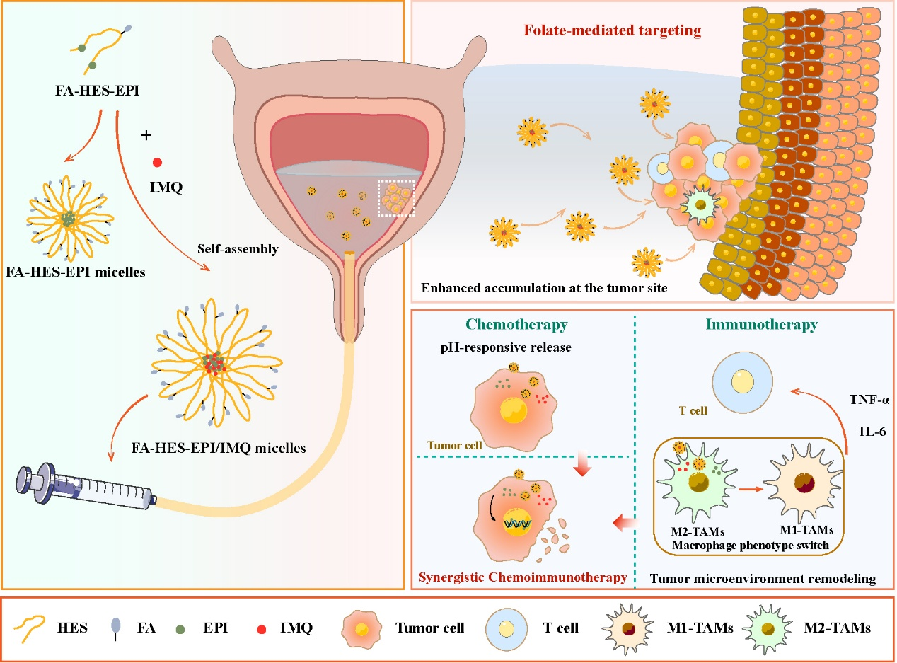 针对上述问题,研究团队首先通过酯键和腙键,分别将叶酸(FA)和表柔比星(EPI)偶联至羟乙基淀粉(HES),成功合成了叶酸修饰的羟乙基淀粉表柔比星前药(FA-HES-EPI)。以此为基础,通过纳米沉淀法在胶束疏水核心中包载TLR7激动剂咪喹莫特(IMQ),形成稳定的FA-HES-EPI/IMQ胶束。其中,FA修饰赋予胶束良好的肿瘤靶向能力,并通过FA受体介导的内吞作用促进肿瘤细胞的高效摄取。同时,该递送体系中的酸敏感腙键可在酸性肿瘤微环境中发生断裂,实现EPI和IMQ的同步释放,从而发挥协同化疗-免疫治疗作用。在原位膀胱癌大鼠模型中,FA-HES-EPI/IMQ胶束显著增强了药物在肿瘤部位的富集,促进M2型肿瘤相关巨噬细胞向M1型巨噬细胞极化,并可有效重塑肿瘤基质,显著提高了膀胱癌的局部治疗效果,肿瘤抑制率高达96.7%。此外,FA-HES-EPI/IMQ显著降低了EPI的全身毒性,表现出良好的生物相容性。该研究构建了一种集肿瘤主动靶向、酸响应释药和化疗-免疫协同治疗于一体的膀胱灌注纳米递药系统,为提升非肌层浸润性膀胱癌术后局部治疗效果、降低肿瘤复发风险提供了新的思路和技术策略,也为膀胱癌局部治疗创新制剂的开发提供了重要的理论依据和技术支持。