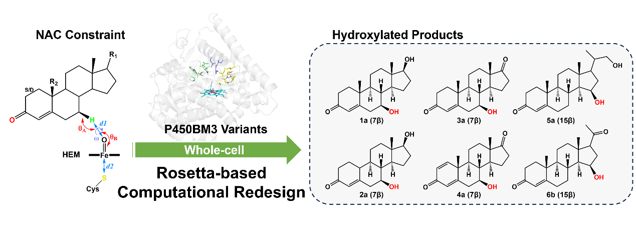 甾体化合物是众多高价值药物的核心骨架,其生物活性高度依赖于特定位置和构型的羟基化修饰。然而,对结构复杂、官能团密集的甾体分子进行高效、精准的区域和立体选择性羟基化,一直是化学合成与生物催化领域的重大挑战。传统化学催化剂常受限于空间位阻和官能团兼容性问题,而天然P450酶虽具催化潜力,但对其非天然底物(如甾体类化合物)往往表现出活性低和选择性差等问题。